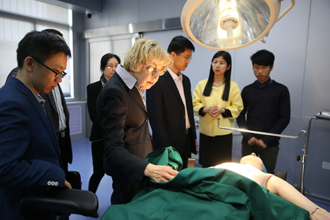 4月13日上午,德中护理协会首任主席Astrid Vonhoff、威海万方人才合作有限公司总经理董华一行来我院交流访问,我院党委书记王志凯、学务长邱永建出席,教务部、外事部、护理学院相关负责同志及人员参加,会议由外事部主任樊永兵主持。 首先,王志凯对Vonhoff一行表示欢迎。他从学校的发展概况、人才培养、对外交流合作及办学成果等方面介绍了我院的办学情况。王志凯表示,此次Vonhoff一行来访开拓了我院对外交流与合作新资源,期望各方能够就护理人才培养发挥各自资源优势,展开深层次交流与合作,并取得丰硕成果。 Vonhoff充分肯定了我院的人才培养模式,同时她也向我院领导介绍了德国医疗体系、护理保险、护理职业形式等内容。她指出德国医院的构成与作用和中国的医院略显不同,其中医疗理念、“预防”理念更具特色。董华重点向我院领导介绍了万方人才公司目前开展的国际业务领域及内容。 与会人员就中德护理人才培养、德国护理职业体系、护理人员职业发展进行了交流与讨论。Vonhoff表示愿意帮助我院更多优秀学子赴德国深造发展,为促进中德护理人员交流贡献力量。座谈结束,王志凯、Vonhoff、董华共同签署了合作备忘录。 会后,Vonhoff等人先后参观了学院数码互动实验中心、书院功能区、国际护理培训中心。在国际护理培训中心,15级护理专业贺笑颖等学生熟练的心肺复苏术及静脉输液演示获得了来访人员的一致好评。 下午,Vonhoff等人在行政楼第二会议室分别与护理学院教师及护理专业学生就护理人才培养、护理医疗体系、护理学生海外发展等问题进行了深入交流。